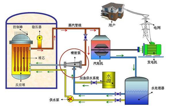 首先,人们把用作反应的高浓缩铀235燃料棒放在水管里,让水泵带动水流动,从下方经过燃料棒,被加热之后变成水蒸汽,从上方管口流出。加热后的水和水蒸汽混合物进入分离器分离,高温蒸汽带动涡轮机发电,热水和新注入的冷水混合,再次进入水泵。这样过,热的蒸汽流出,冷水再注入,不停的把燃料棒的热量带走,因为水冷却了反应堆,所以称之为冷却剂。