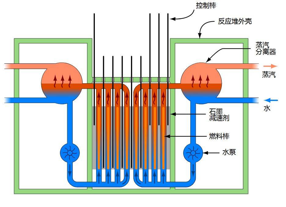 切尔诺贝利核电站使用的是石墨沸水堆(RBMK),这个核反应堆的基本结构如图:
