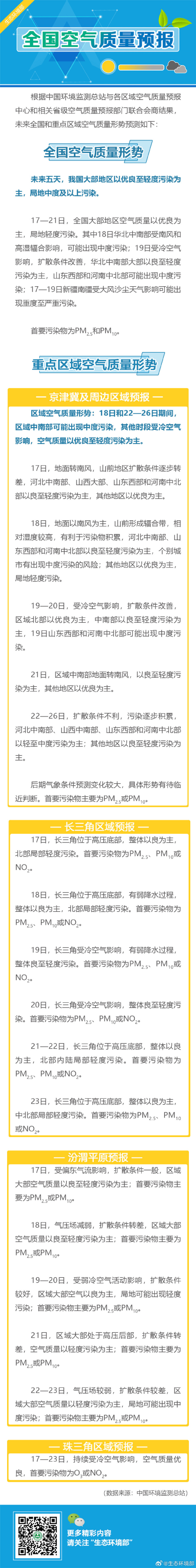 未来五天(12月17—21日),我国大部地区以优良至轻度污染为主,局地中度及以上污染。 ???